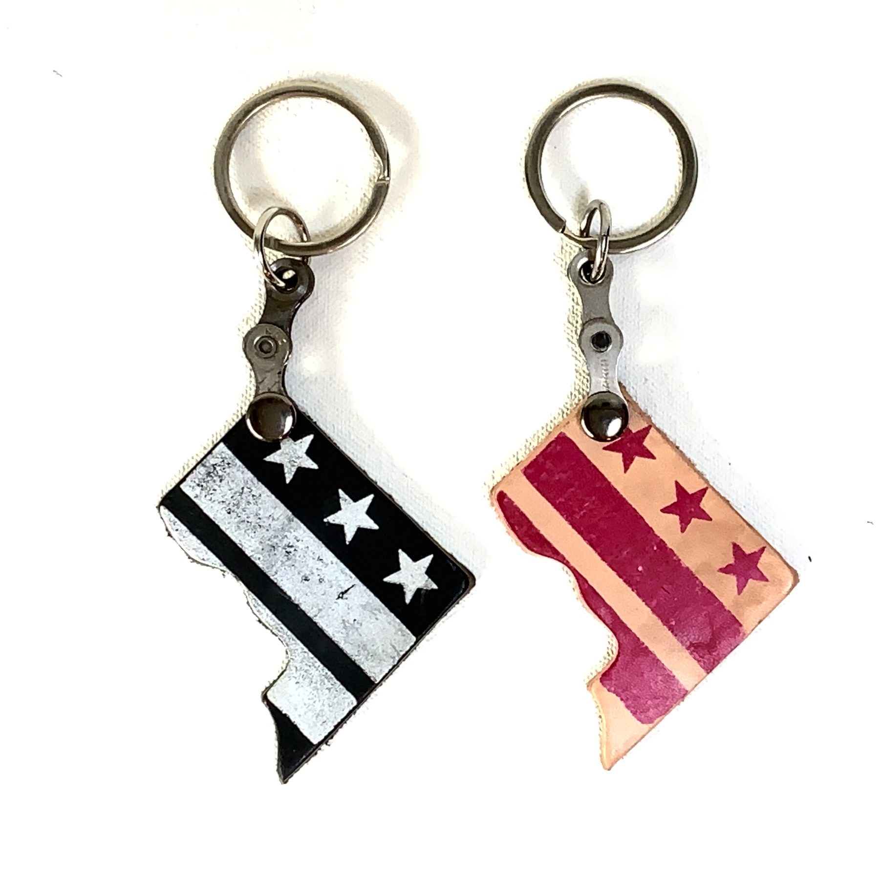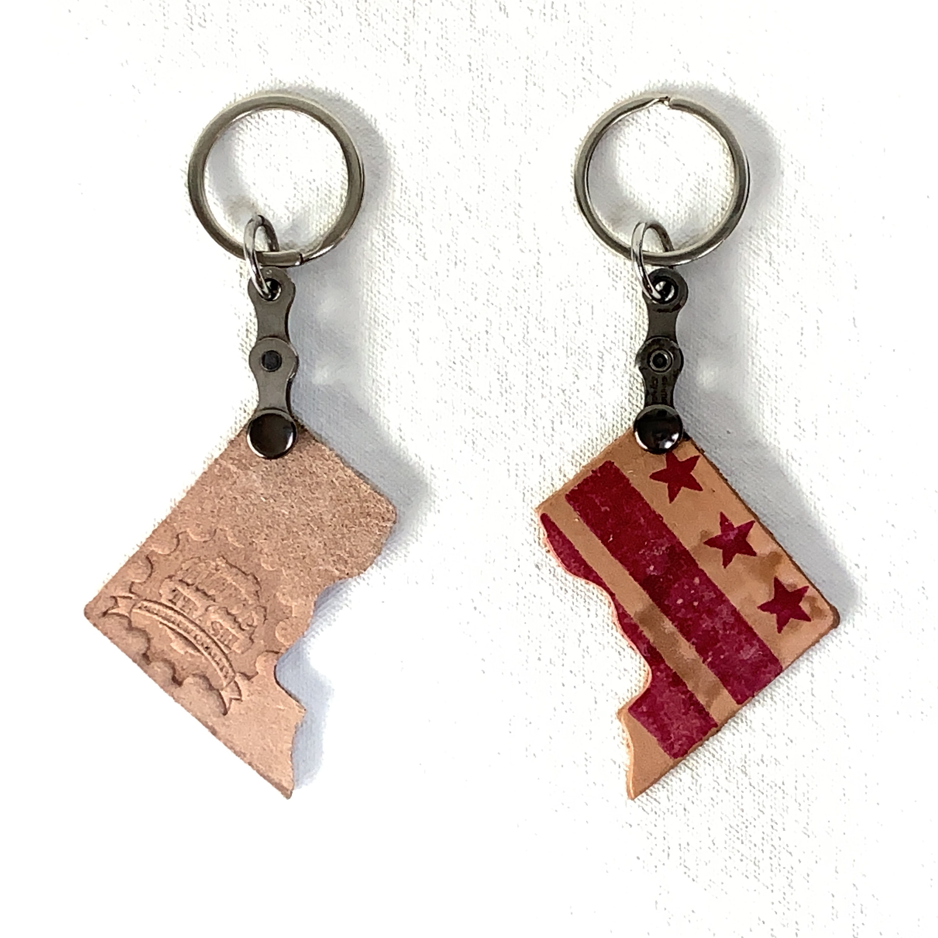 The DC Keychain is made with scrap leather, die cut in shape of the District of Columbia, and attached to a split ring with links of bicycle chain. The DC flag is stamped on one side, and the Bicycle Trash logo is embossed on the other. (Available in red on white, or silver on black.)