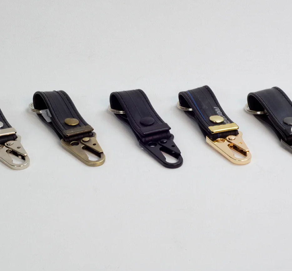 A recycled rubber keychain, made using stitched bicycle inner tube. Durable, weather resistant, sustainable design. Vegan, with a leather-like look.