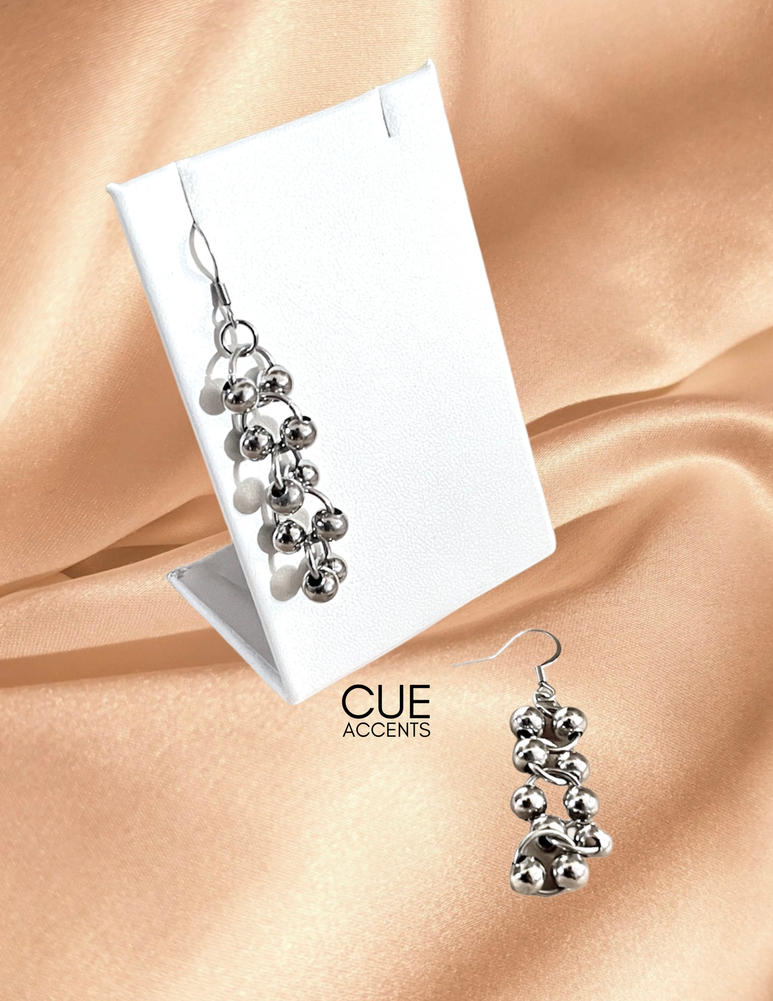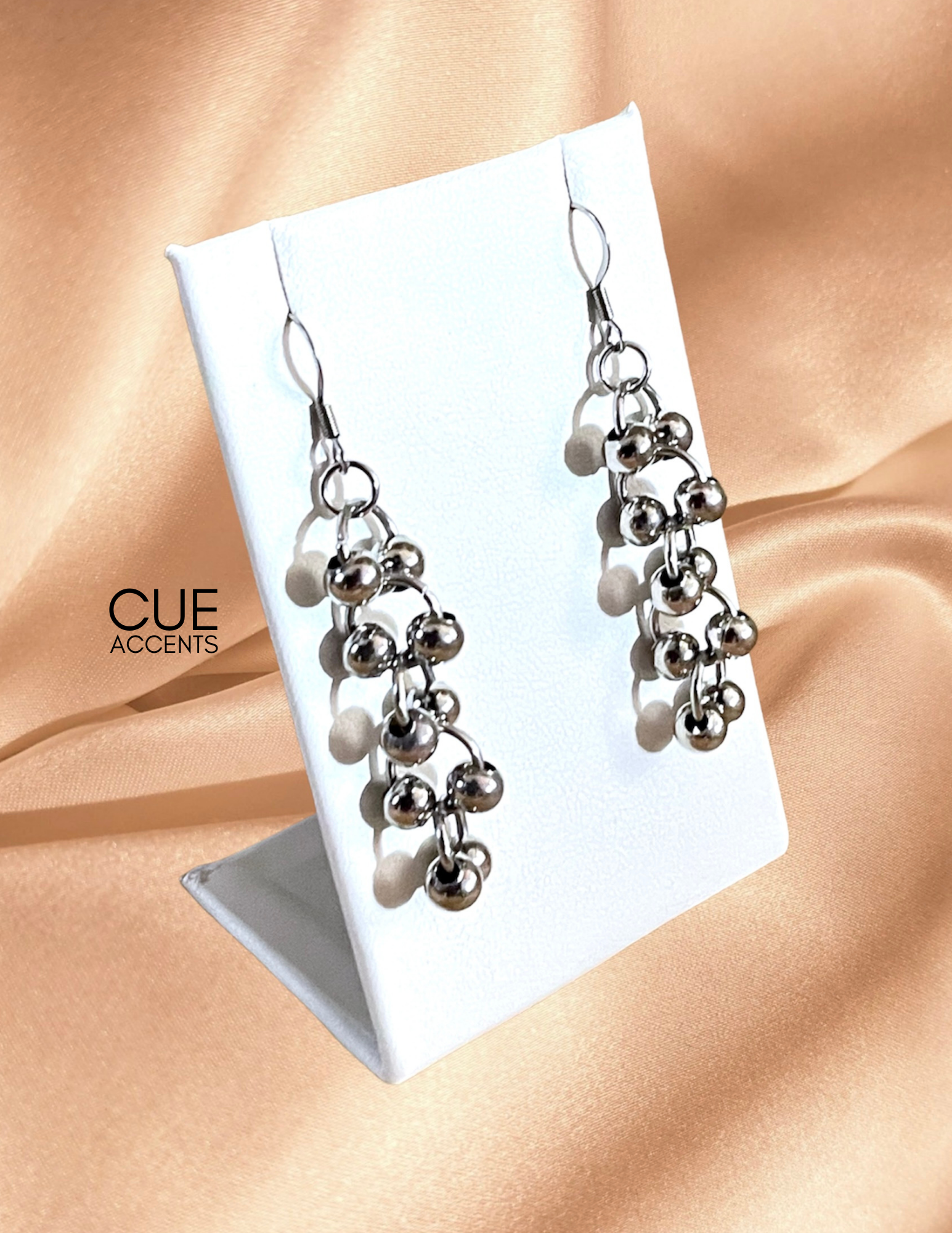 This pair of earrings are the perfect accessory to any setting or event. Its air of sophistication is perfect for special events, date night, business, and more. With its twist on traditionalism, it has the power to accentuate any look with a dangle of silver. Utilizing steel beads, we add a bit of flair to enhance the nature of the dangle, giving off a grape vine effect. Made completely of stainless steel, these pairs are durable, hypoallergenic, and tarnish resistant. Currently available in two sizes: mini and medium (this listing). Take the cue. IG: @CueAccents Link: www.linktr.ee/cueaccents