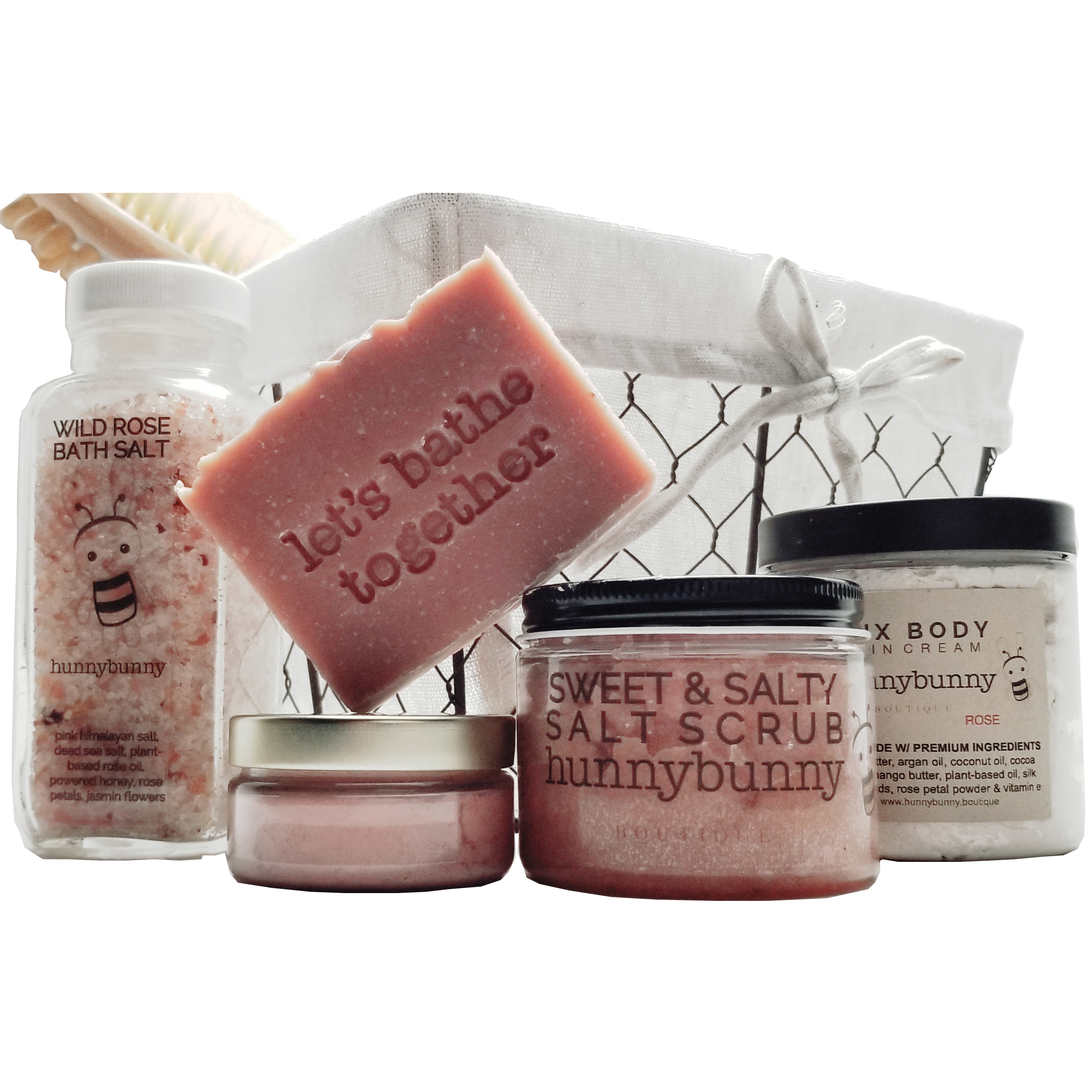 Romantic Spa - The Luxury Rose Edition is our gift basket for lovers and intended to be shared. It includes the following: 1. Wired Rope Basket (or similar) 2. Wild Rose Bath Salt 3. Long Handle Combo Bristle Brush 4. LUX Rose Body Cream 5. Pink Himalayan Salt Scrub 6. Rose Clay Facial Mask 7. Rose Clay Body Bar INGREDIENTS: (Bath Salt) Pink Himalayan Salt, Dead Sea Salt, Plant-based Rose Oil, Rose Petals, Jasmin Flowers. (Body Bar) Distilled Water, Olive oil, Coconut oil, Apricot kernel oil, Sodium hydroxide (does not remain after soap making process), Castor oil, Cocoa butter, Shea butter, Rose essential oil, Rose plant-based scented Oil, French rose clay. (LUX) Shea Butter, Argan Oil, Coconut Oil, Cocoa Butter, Mango Butter, Silk Amino Acids, Plant-based Scented Oil, Rose Petal Powder, Vitamin E. (Facial Mask) French Rose (Kaolin) Clay, Ground Oats, Milk Powder. (Salt Scrub) Pink Himalayan Salt, Coconut Oil, Avocado Oil, Honey, Rose & Cherry Plant-based Scented Oil, Rose Buds, Vitamin E.
