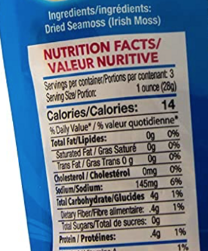 Sea Moss/ Irish Moss 85g BOOSTS IMMUNE SYSTEM - Said to aid in a healthy immune system. Reduces mucous congestion. Contains natural compounds to help get rid of infections and much more REAL WILDCRAFTED in open sea coastal inlets - Marine Protected Area - Non-GMO Small Farmer harvested Fair Pay Advocate. Prepared in a USDA Certified Facility REAL IRISH MOSS SUPERFOOD - Vegan - Gluten Free - RAW - provides fiber & trace minerals REALLY HEALTHY - loaded with Potassium, Calcium, Iodine and Natural Vitamins A, B, D, E & K REALLY NATURAL vegan gelatin substitute. Comes salted with almost NO sea smell.
