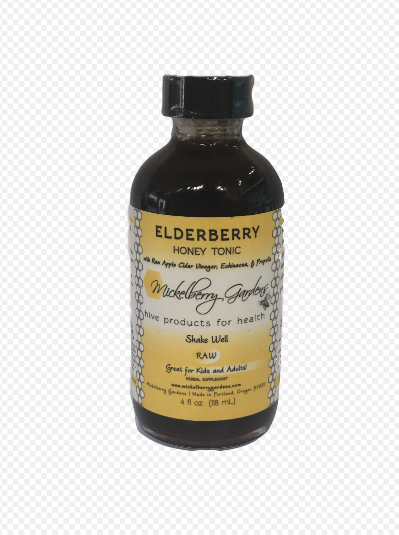 Mickelberry Gardens Elderberry Honey Tonic 4 fl oz Mickelberry Gardens Elderberry Honey Tonic is a blend of raw honey, raw apple cider vinegar, and gentle herbal remedies traditionally used to support healthy immune function. We have included organic black elderberries, organic echinacea tops, and Pacific Northwest propolis to support and nourish the immune system through cold and flu season. Kids love Mickelberry Gardens Elderberry Honey Tonic! It’s an excellent addition to the family medicine cabinet.