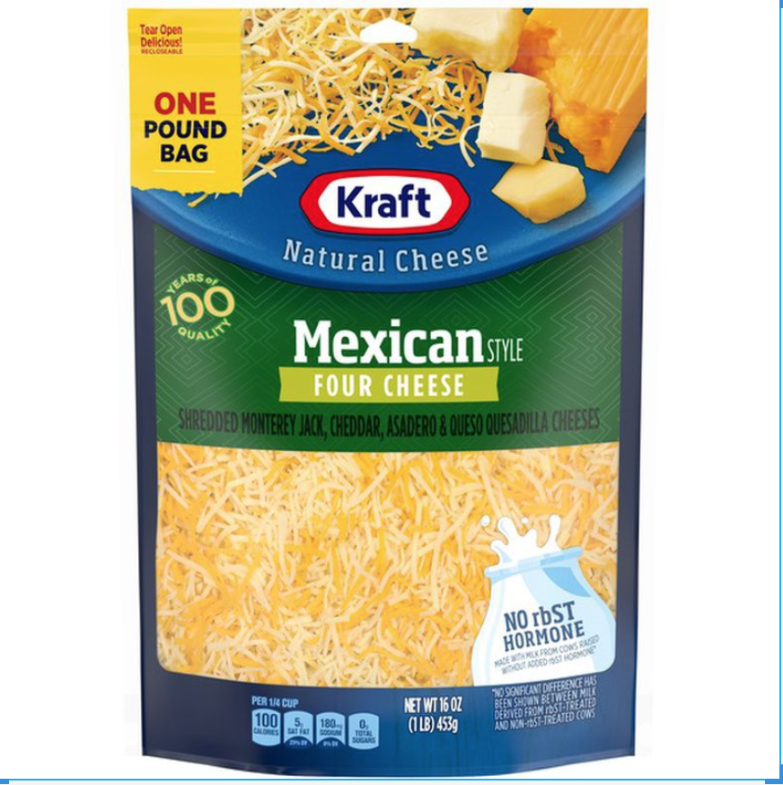 Kraft Mexican Four Cheese Blend 16 oz For over 100 years, Kraft has been making the cheese your family loves.So, no matter how you like it, we've got a cheese for you. Gluten Free Egg Free Fish Free Peanut Free Shellfish Free Soy Free Treenut Free Wheat Free