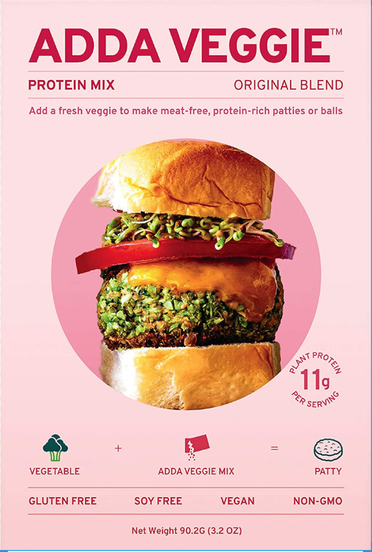 Adda Veggie Protein Mix includes everything you need to make protein-rich, flavor-packed veggie patties or balls. Just add fresh veggies! Our Original blend is a balanced and versatile mixture that you can use in all your favorite dishes. Creates a delicious veggie-forward meal. Works great with broccoli, mushrooms, eggplant and more! Each pack of Adda Veggie makes four 4-oz patties. Each serving contains 11g of plant protein. All of our products are soy-free, gluten-free, non-GMO and vegan.
