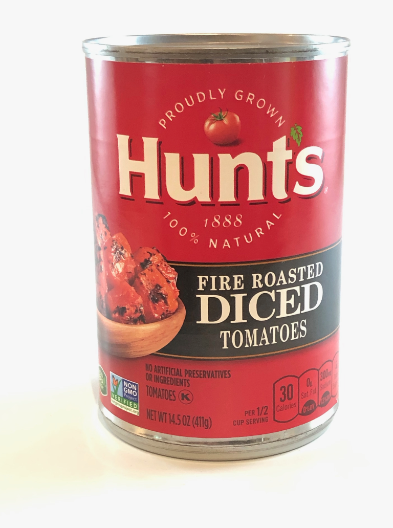 Hunts Fire Roasted Diced Tomatoes 14.5 oz. Product Features: Each serving comes with just 30 calories Non-GMO project verified 3g of sugars per serving Add interesting new flavors to your meals with Hunt's Fire Roasted Diced Tomatoes. Gently roasted over an open fire for a great smoky, Southwestern flavor, they're 100% natural with no artificial preservatives or ingredients, and deliver a fresh-from-the-grill flavor your family will love. This pack includes eight 14.5 oz. cans of Hunts fire roasted diced tomatoes.