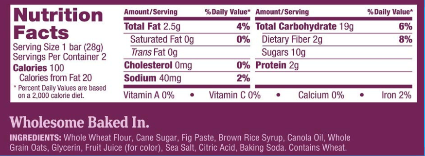Nature's Bakery Whole Wheat Fig Bar Perfect for active, on-the-go nutrition or a healthy treat for kids' lunches and after-school snacks Made with Whole Wheat & Real Figs. Soy Free, Dairy Free, Cholesterol Free, No High Fructose Corn Syrup, 0g Trans Fat. Non-GMO Project Verified, Certified Vegan, Plant Based, Kosher, Made in a Nut-Free Facility.