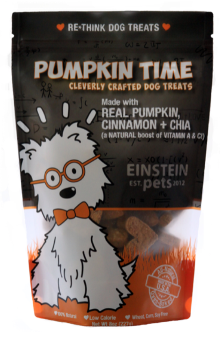 Pumpkin: It's Not Just for Pie. Einstein's signature natural, organic dog treat is here to stay! The incredible taste of pure natural pumpkin, and fresh apples, sweet honey, a pinch of cinnamon, and splash of vanilla makes for a festive and flavorful treat for your pooch! Natural and organic oat flour, pumpkin, apples, honey, cinnamon, vanilla, chia seeds All-Natural Low In Fat Health-Focused Free From Soy Free From Sugar High In Fiber Low In Calories Small-Batch Free From Corn Cinnamon Pumpkin Peanut Butter