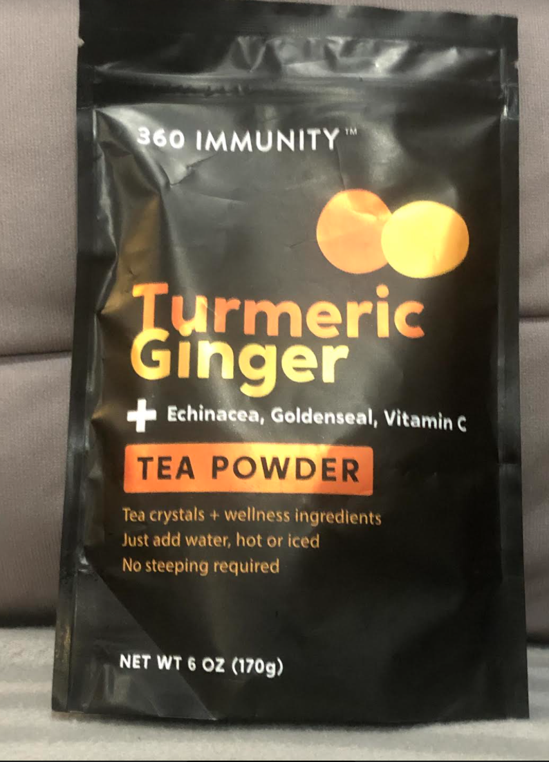 Goldenseal, Vitamin C 6 oz A powerful blend of Turmeric and Ginger that provides support to help fight the elements. Simply warm water to enjoy this soothing caffeine-free tea blend anytime of the day. • Tea Crystal + Wellness Ingredients • Just add water, hot or iced • No steeping required • 6 oz (170g) Ingredients: Dietary Soluble Fiber, Turmeric Root Powder, Citric Acid, Ascorbic Acid, Echinacea Powder, Ginger Powder, Stevia Leaf Extract and Goldenseal Leaf Powder