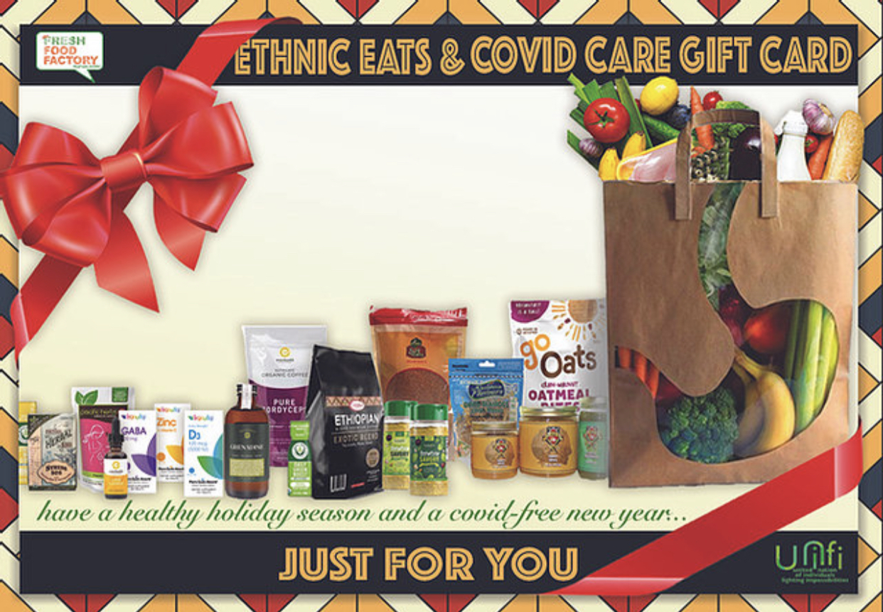 We want everyone to have a healthy holiday season and COVID-FREE New Year, 2021! Due to the pandemic, we cannot host our holiday tasting that we had on last year, so this holiday season, we have our essential Ethnic Foods/COVID Care gift bags filled with flavorful ethic foods that promote the maintenance of a healthy weight throughout the holidays and essential immunity boosting foods to defend yourself against viruses. So as the holidays and the said “3rd wave” of COVID-19 approach, we're aiming to provide you, your friends and staff, and at-least 100 families in need, with the essential foods that they need to have a healthy holiday season and a COVID-FREE New Year! Buy a $25 gift card for a family member or friend and/or will you donate a gift care to help feed a family in need?